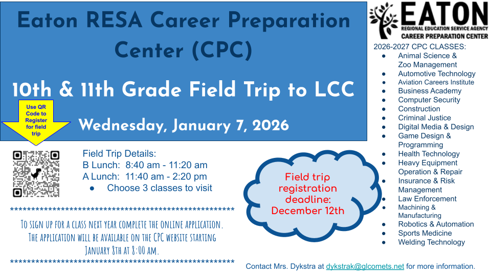 10th & 11th grade Field Trip to LCC will be Wednesday, January 7th, 2026. Field trip registration deadline is December 12th. For more information about the field trip as well as info. about signing up for LCC classes next year, click HERE.