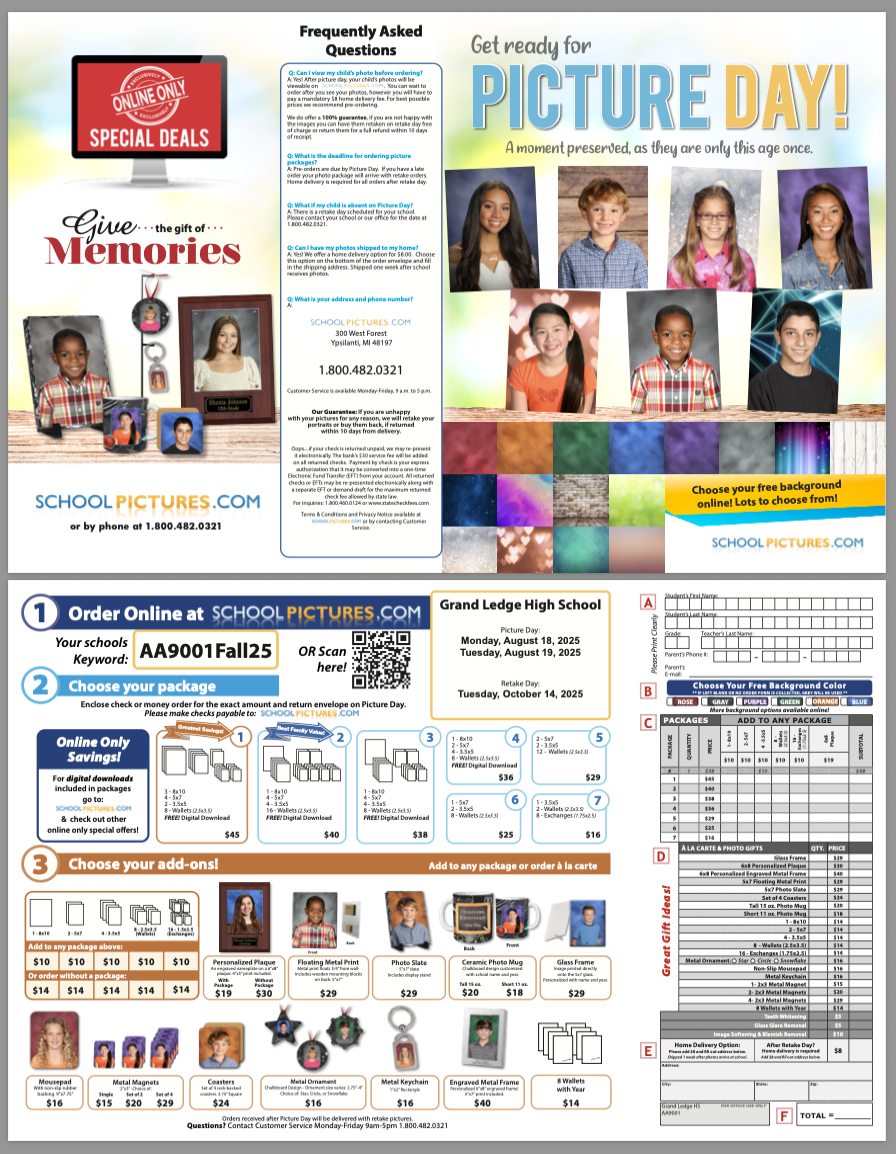 For Students Who Have Not Yet Had a Photo Taken Ordering will be available once your student's photo is taken and uploaded to their gallery, typically within 7 days after Retake Day. You will receive a unique code or link to access your student's gallery, either via a card sent home with your student or through an emailed link. If you prefer to prepay for the retake photo, you can submit a paper order form to the photographer on Retake Day. Free shipping to the school is offered for orders placed within two weeks of Retake Day. Orders placed after this period will be shipped to your home and will include a shipping fee.